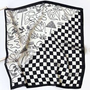 ⭐Black White Checkered Silky Satin Scarf Figural Print Luxury Square Fashion New