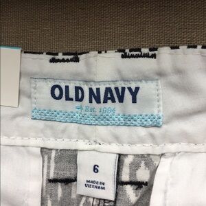 Black and white cotton Ikat pattern Old Navy shorts. Sits below waist, relaxed through hip and thigh. 5” length. Size 6. 100% cotton.