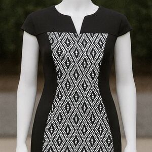 Sleek, modern, and figure-flattering — this dress is a statement piece you can wear anywhere. Featuring a bold black and white diamond pattern panel down the front, framed by solid black side panels for a slimming effect, this sheath dress gives a structured yet elegant silhouette. The subtle V-notch neckline adds a touch of sophistication, perfect for work, events, or a night out.