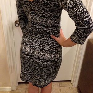 Black dress with white design. 96% polyester, 4% spandex. 3/4 length sleeve. Stretchy and flattering.