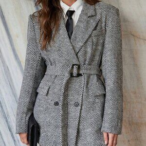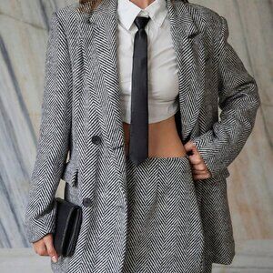 Black & White Elegant Women's Herringbone Oversize Blazer Jacket + Mini Skirt