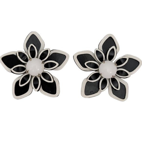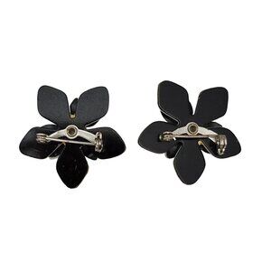 This pair of sleek flower brooches is a beaut of statement. This brooch features a delicate, black-and-white enamel double-layer flower design. It measures 1.28 inches long and comes on a safety pin back. This piece is very eye-catching and a great piece to keep.
