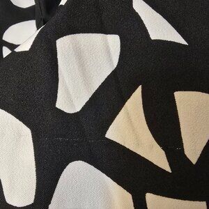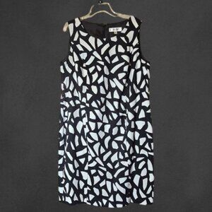 Geometric design black & white dress by JONES STUDIO. There are a couple of flaws in the material, only noticeable on inspection, shown in photos. Back zipper and hook & eye closure. Perfect for office, church or dinner.