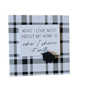 Plaid accent sign – “What I love most about my home is who I share it with”