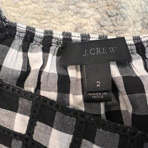 Black + White check short-sleeve shirt with black fringe/pom-pom trim. Size 2, fits like a Small. GUC. Lightweight cotton material.