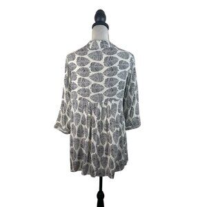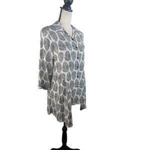 Black & White Leaf Print Button-Down Tunic Top With Asymmetrical Hemline & 3/4 S
