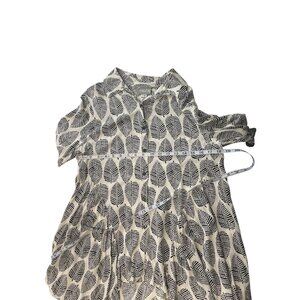 Lightweight tunic top featuring a bold leaf print, button-down front, and flowy asymmetrical hemline. Suitable for casual or professional wear.