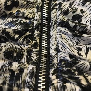 Ruched faux corset design featuring a bold animal print. Fabric is stretchy and shimmery. Has one hole in the seam on the inside underneath the padding on the chest.