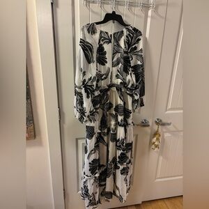 Gorgeous vneck dress. Black and white floral design. Tiered ruffles. Fully lined besides the sleeves. Chiffon material. Very comfortable.