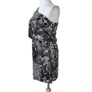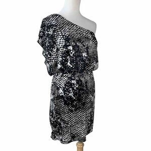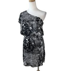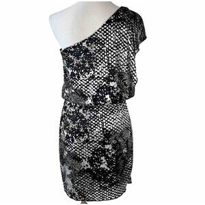 Elevate your party style with this stunning one-shoulder dress from City Triangles. The black and white color pattern adds a touch of elegance while the gathered waist accentuates your curves. This mini dress with one sleeve is perfect for a night out or a cocktail party. The size is small and it fits like xs/s.