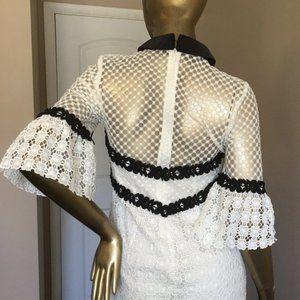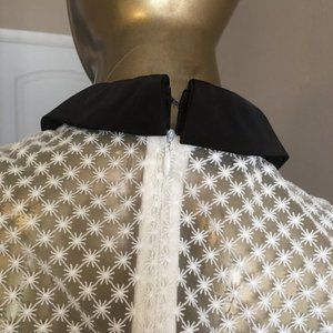 Black & White Petal Shift Dress with Collar in EXCEPTIONAL Condition! Contrasting Fabrics and trim Shift Dress with school girl collar and sweet velvet tie detail at neck. Adorable three-quarter bell sleeves. Concealed zip closure at back. hook/eye at collar. Fabric looks delicate, but is not "flimsy", lined and well-made with beautiful trim details. All tags were removed, I cannot confirm fabric content or manufacturer. Image search online will lead you to a Self Portrait mini dress, but this seems longer than mini. Measurements below point to a size 4 according to the size charts found online APPROV MEASURE (laid flat) 14" shoulder to shoulder 16.5" armpit to armpit 15.5" waist 16" sleeves 34" shoulder to hem As it reaches the sections with the black trim, the zipper wants some careful pulling at those seams due to the gathering of layers of fabric. Works correctly, but wanted to mention so it wasn't perceived as a flaw