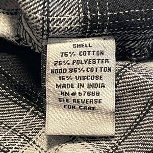 • Plaid pattern with contrasting gray hood