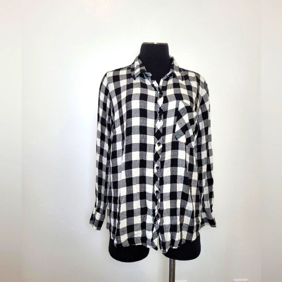 Super cute Flannel shirt in a black and white Buffalo Plaid print. Pocket on one side and full length sleeves. Lightweight viscose material. Good condition. Tagged size 0X or 14W, measures approximately 28 inches long 23 inches underarm to underarm laid flat.