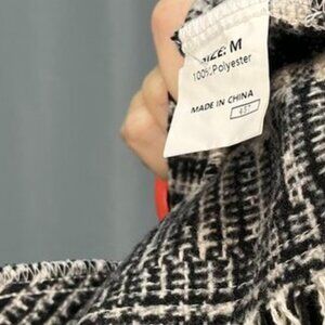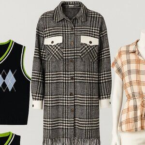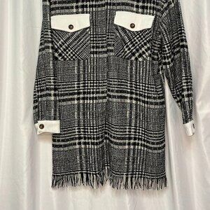 Keywords: plaid jacket, fringe hem coat, black white plaid coat, sweater jacket, oversized plaid coat