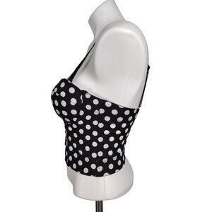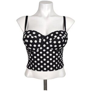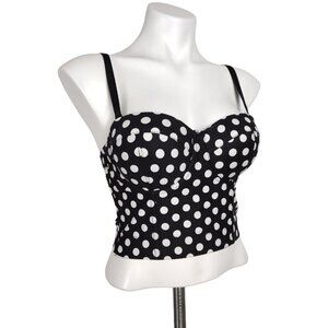 Black bustier corset top featuring a white polka dot print. The straps are detachable so it can be worn strapless. It has underwire for support and the cups are lined. Multi row, back hook and eye closure. Silicone gripping on the inside to help it stay put. Super cute, retro pin up style. Very versatile, wear with your favorite jeans or a cute fit and flare skirt.