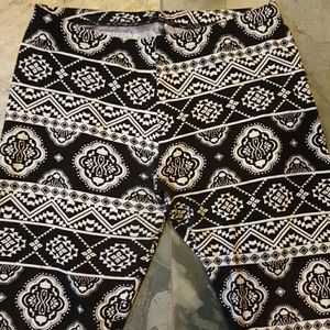 These are the basic cotton leggings from Charlotte Russe. Normal waist height and band, normal length. Black and white mixed Brinton with stripes, geometric shapes and patterns, and a little feminine rounded edge print in there as well. Worn a couple times, still in good condition. I'm a "medium" bottom-- size 6-10 pant depending on brand, so I could fit medium leggings, but I always go up to a large for printed leggings so the print doesn't stretch out. If you'd like to see them on, just ask!