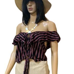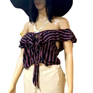 Black, White, Red Striped Ruffle Tie Cropped Blouse - Large Roughly 17” pit to pit 17” long. Good used condition.5 buttons, no known flaws