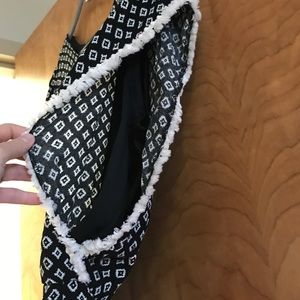 Black & white romper, open slot in back. Open arms with black material covering inside (shown above).