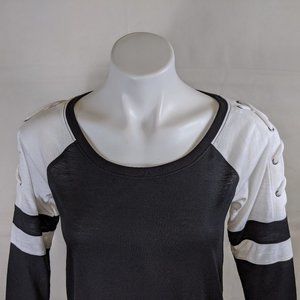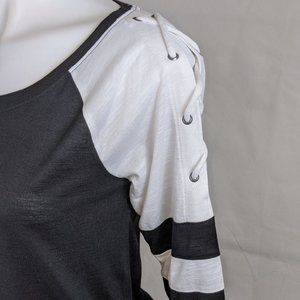 Great style for your next sporting event. 3/4 length sleeves with a boat neck top and slashed sleeves. Fabric is slightly sheer and the shoulders are sliced with the cord and grommets holding them together.