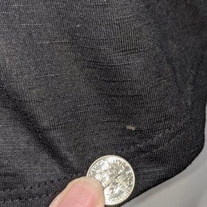 Small hole as shown on the front hem of the shirt. No other visible issues or defects.