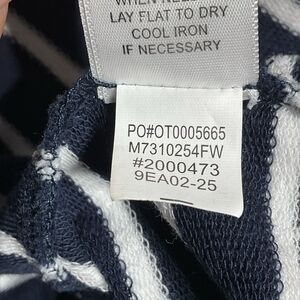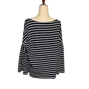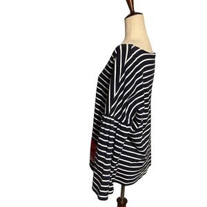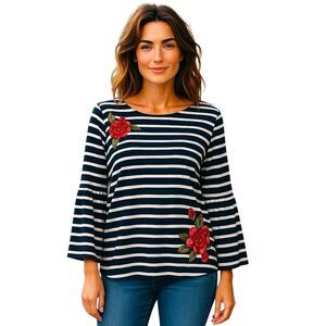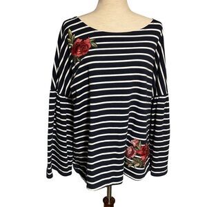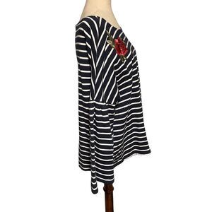 This stylish black and white striped top features beautiful floral embroidery, offering a blend of classic and modern design.