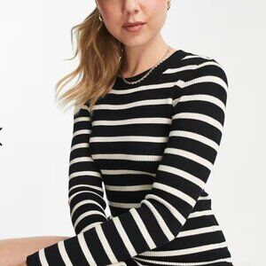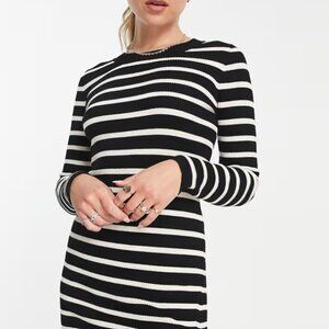 This black and white striped knit mini dress by Stradivarius channels retro mod style while keeping you cozy for the colder months. With a flattering bodycon fit, round neck, long sleeves, and stretchy knit fabric, it offers a great balance of comfort and style. The weighty material provides warmth without sacrificing shape, making it a chic piece for your winter wardrobe.