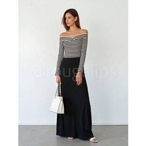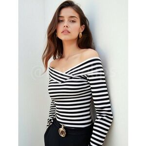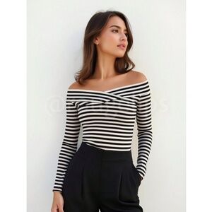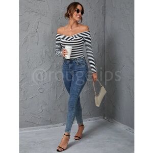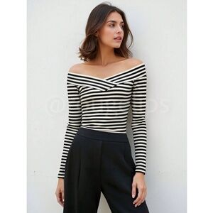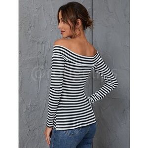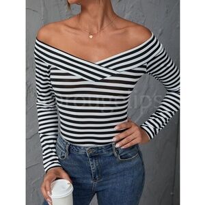 Black & White Striped Off Shoulder Long Sleeve Tee Shirt Top Slim Fit