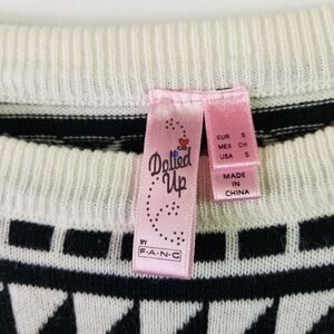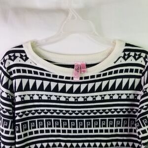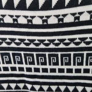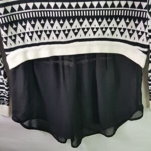 Top is black and white Aztec type print made of thin sweater material. Bottom is black sheer fabric peplum. Size S. Approximate measurements are pit to pit 18". Length is approximately 27". Sleeves are 22". Like new sweater.