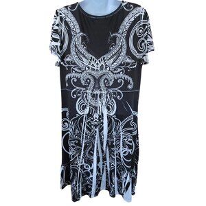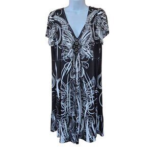 Black & White Swirl Dress With Intricate Butterfly Pattern & Rhinestone Accent