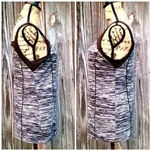 Athleisure tank top in black & white space dye stretch fabric w/ black trim. H-back, scoop neck, built in shelf bra. Issues noted in photos. Good preowned condition, overall. Size Large by Victoria's Secret Sport