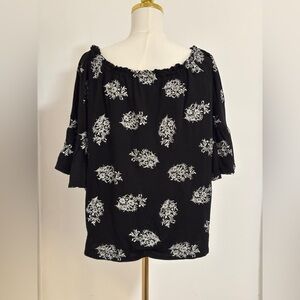 Chic black blouse with white floral design. Features a relaxed fit and elegant style.