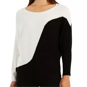 Curved lines define the colorblocked design of this BCX dolman-sleeve sweater featuring a mix of horizontal and vertical ribbing.