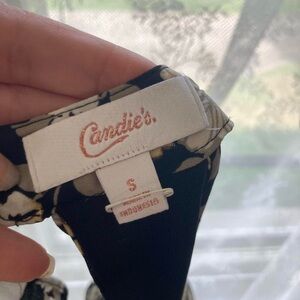 Black Gold Trim floral halter mini top with ruffle details and open back Candies S
