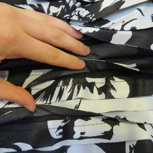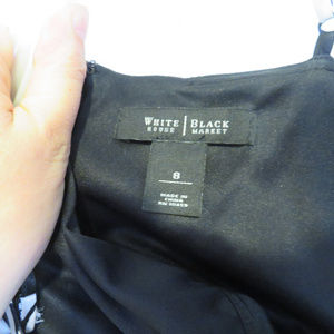 This is a White House Black Market black and white dress. Size 8. The dress is layered strips of fabric sewn to a polyester netting. It is actually quite stretch and quite forgiving. It is very comfortable. The straps are spaghetti straps and are adjustable. This is a great cocktail dress.