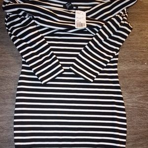 A ribbed knit off the shoulder quarter sleeve mini dress, featuring a black and white stripe print.