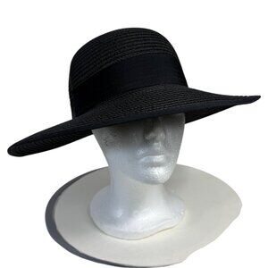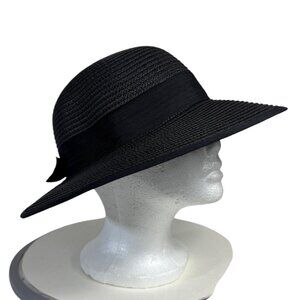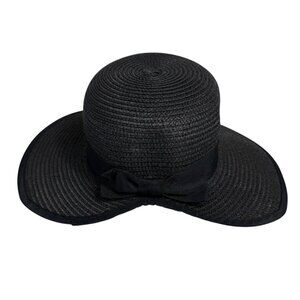 Black Wide Brim Straw Hat Sun Ponytail Notch Ribbon Bow Sophisticated Church Eve