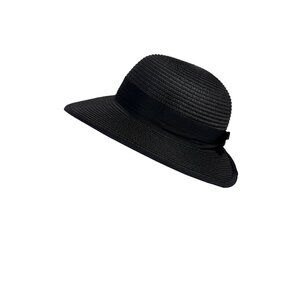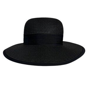 This elegant wide-brimmed black straw hat offers a sophisticated style for sunny days, featuring a classic ribbon bow accent. Ideal for outdoor events, it provides shade and a timeless look to complement formal attire.