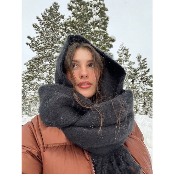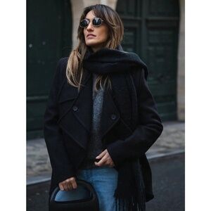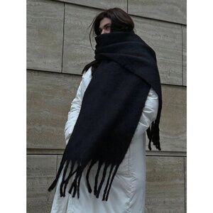 Black Wide Shawl Scarf With Tassels Fuzzy Knit Tassel Fringe Detail Hem