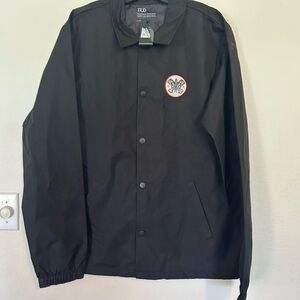 This sleek black windbreaker is crafted from a smooth, water-resistant material, making it ideal for mild weather conditions. Its lightweight design ensures comfort and ease of movement, while the classic button-up front adds a touch of timeless style.