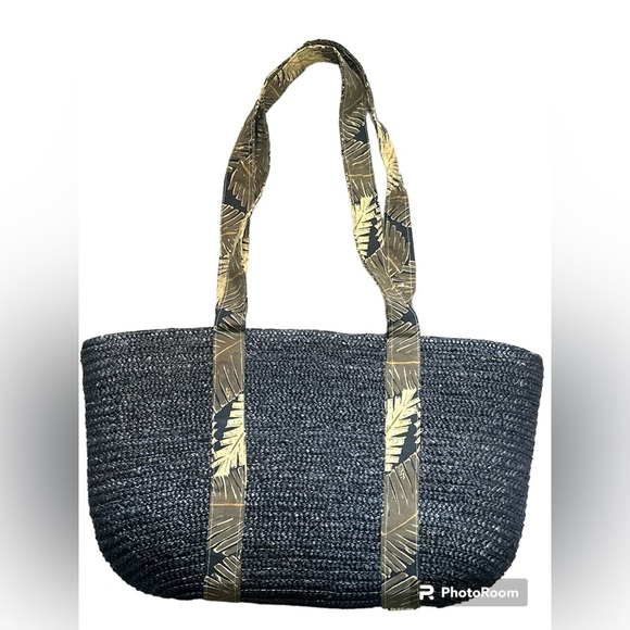 Black With Tropical Print Large Straw Beach/Summer Tote Bag