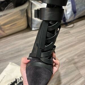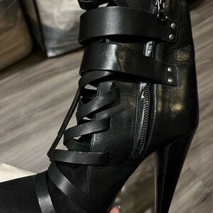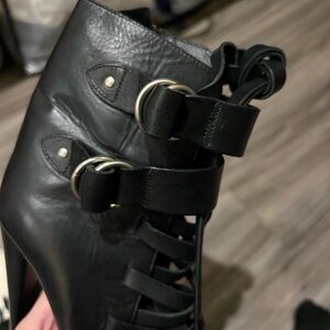 Step out in style with these chic black ankle boots. Perfect for any occasion, they offer both comfort and elegance. Never worn. Leather and suede. All black. Zipper and ties. Cool rocker chic