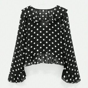 Black Women's Polka Dot Print Design Front Bow Tie Ruffle details blouse