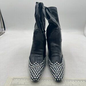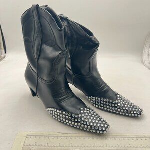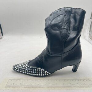 Black Women’s Rhinestone Cowboy Boots Pointed Toe Mid Calf Boots Low Heel Boots