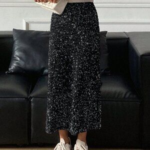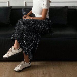 Elevate your party style with this stunning sequin embellished skirt, designed to fit close to the body for a sleek, skinny silhouette. The long, straight skirt features a slit detail and an all‑over print for added visual interest. Perfect for making a statement at any party or special occasion, this black skirt is sure to turn heads.