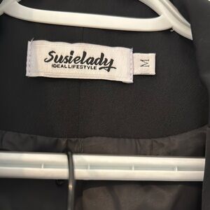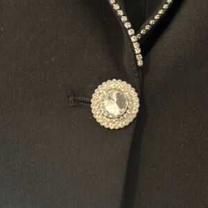 Elegant black suit set with rhinestone buttons. Includes blazer and pants. Perfect for professional settings or a fancy party pant inseam 30”