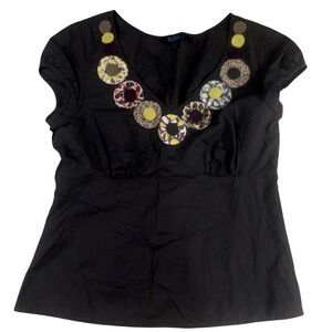 Boden blouse, floral applique top, black cotton top, boho chic blouse, cap sleeve shirt, V-neck top, UK brand, Boden size 10, colorful detail, women’s business casual, artisan style