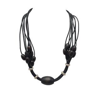 This elegant necklace features multistrand cords adorned with black wooden beads and silver accents. Its sophisticated design pairs well with various formal attire, offering a bold yet understated aesthetic. A unique addition to any jewelry collection.