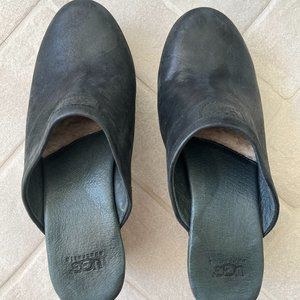 Gently used size 8 black seude Ugg clogs with wooden heels. The heel height is 3 inches. Worn three times and look new. The clogs include a cozy sheepskin lining on the ball of the foot that keep feet warm during the colder months. These clogs look great with dresses, flared jeans, and skinny jeans. Definitely a classic look.