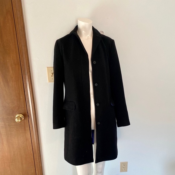 Gorgeous Black Woolen Coat with Blue Silk/Cashmere! Super comfortable and classy. Lightly worn, and in GREAT condition. Originally $230.