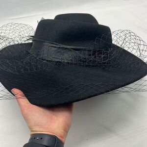 This is a great black wool women's formal hat with netting & feathers! Please note the wool not perfectly clean but it is still in great condition, see last picture.
